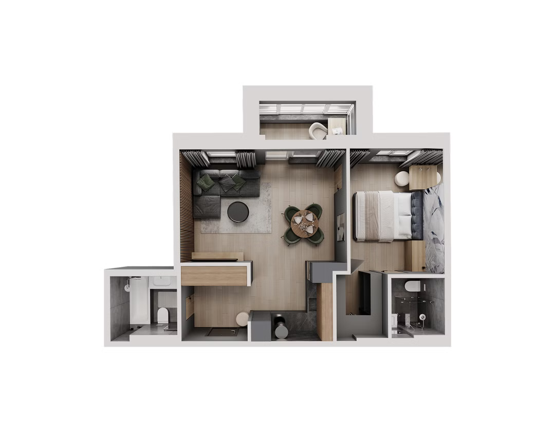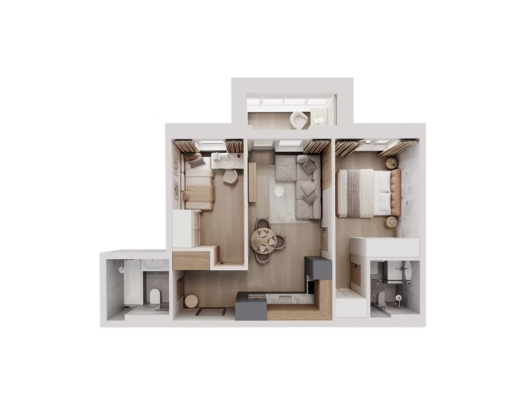 - Для пар с совпадающими биоритмами и разными предпочтениями. Если утром вам обоим нужно собраться на работу, принять душ и выполнить прочие утренние ритуалы, два санузла станут настоящим спасением и гарантией бесконфликтного начала дня. Площадь таких уютных и продуманных квартир — всего от 48 м². В первом варианте планировки всего одна спальня, но целых два санузла — всё для вашего комфорта.