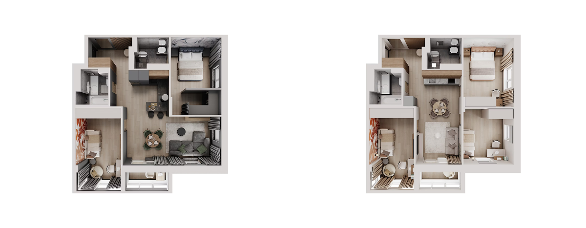 Просторная квартира с двумя санузлами и балконом. В ней вы можете предусмотреть мастер-спальню и две детских комнаты. Из окон открываются урбанистический вид (на севере) и вид на лес (на востоке).