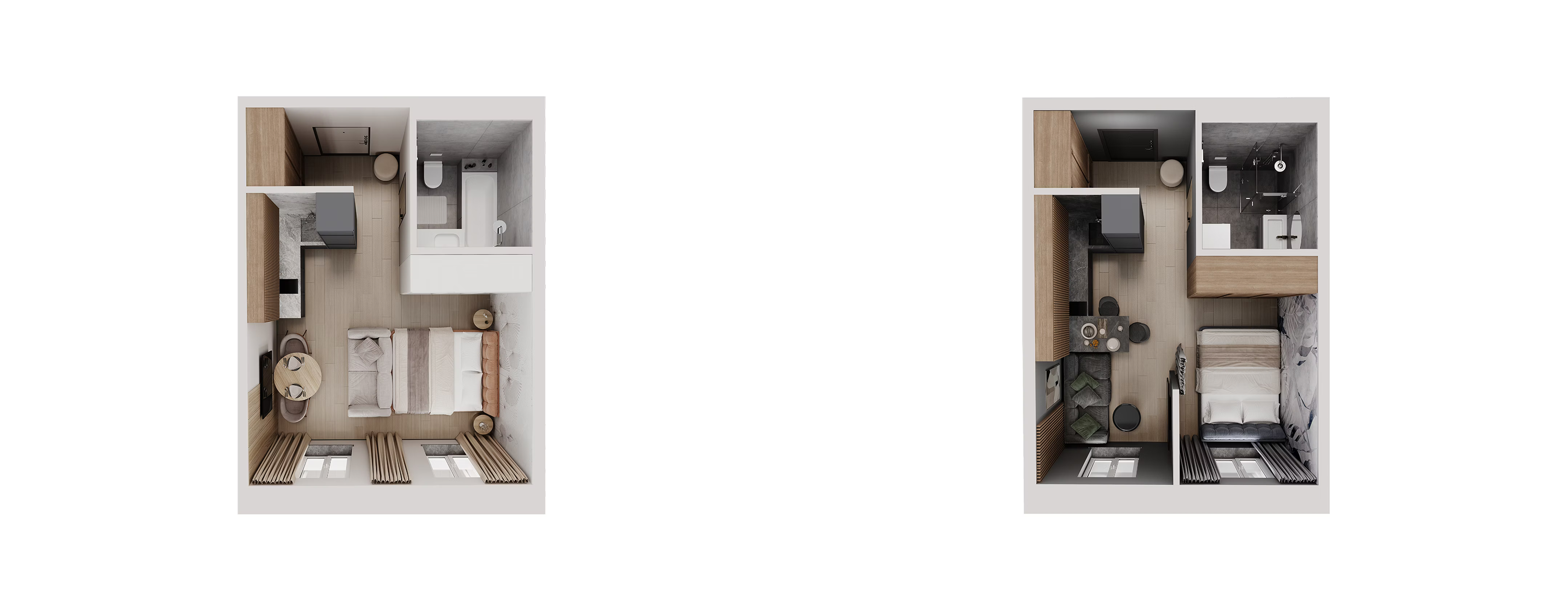Уютная, светлая студия с двумя окнами. Благодаря двум световым точкам, вы можете удобно зонировать квартиру: например, организовать спальню у одного окна, а кухню-гостиную у другого.